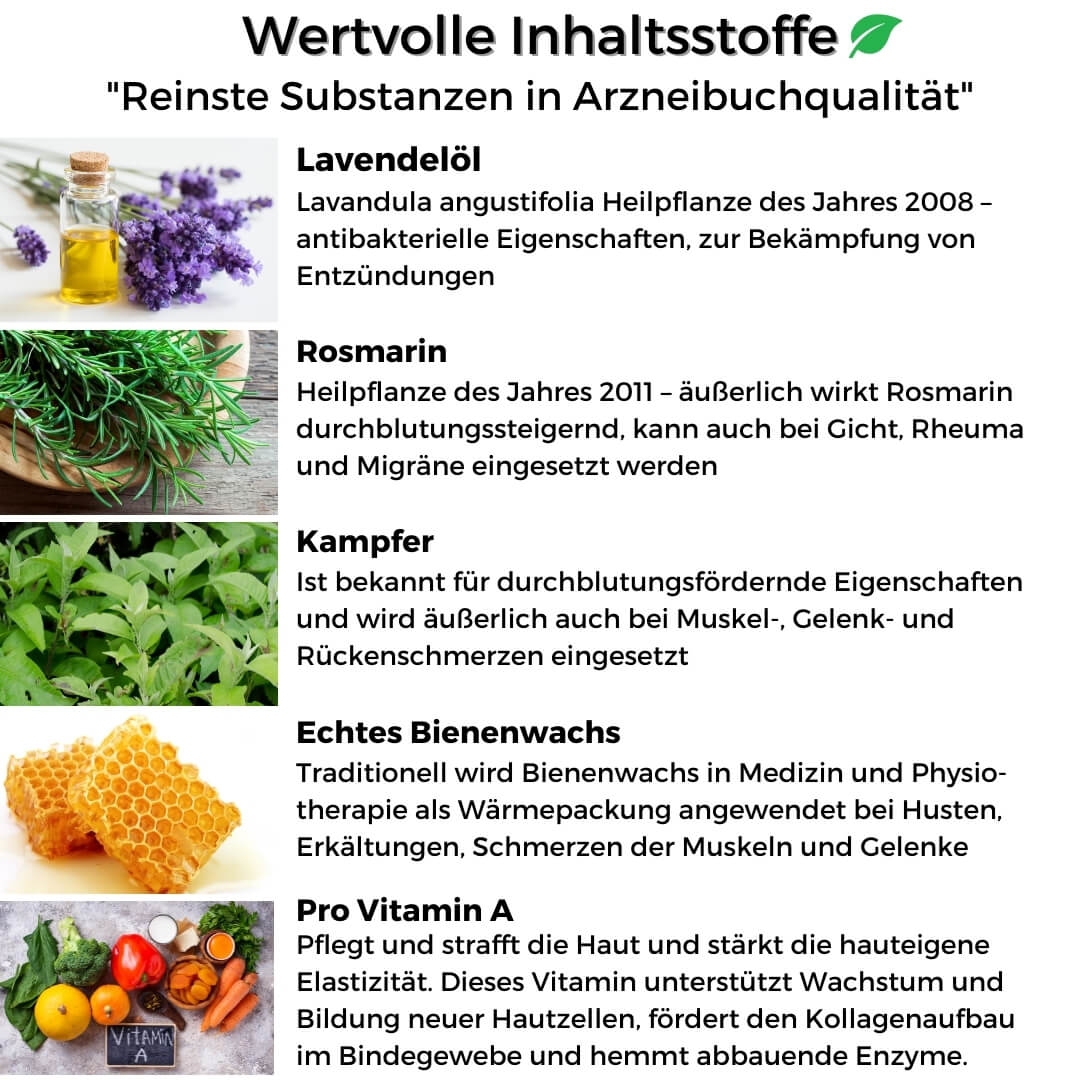 - vitalisiert, durch Kamfer, Rosmarin- und Lavendelöl. Die ätherischen Öle dringen tief ein